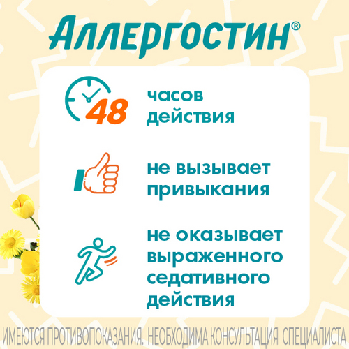 Аллергостин® - противоаллергическое средство, содержит действующее вещество эбастин, блокатор гистаминовых H1-рецепторов длительного действия.