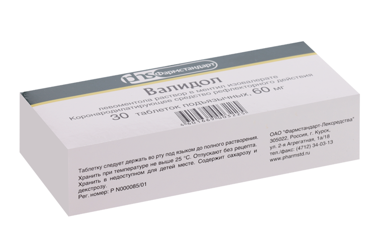 | Валидол | Таблетки подъязычные 60 мг: 6 или 10, 30 ,шт. рег. №: Р N000085/01 от 16.07.10 - Бессрочно Дата переоформления: 26.11.19 |