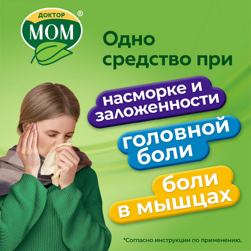 Симптоматическая терапия острых респираторных заболеваний, сопровождающихся насморком, чувством заложенности носа, а также при мышечных болях, болях в спине, головных болях.