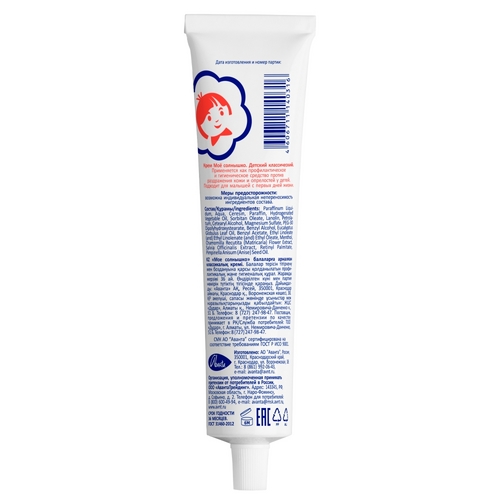 В состав крема входит высоковязкое минеральное масло фармакопейного качества, которое смягчает кожу, комплекс минеральных липидов защищает кожу от воздействия внешних негативных факторов, восстанавливает ее барьерные функции, витамины A и F способоствуют регенерации кожи, экстракт ромашки и масло эвкалипта успокаивают кожу, обладают антисептическим и противовоспалительным действием. Алюминиевая туба позволяет производить крем без консервантов, т.к. алюминий не влияет на качественные характеристики крема, а также не позволяет воздуху контактировать с продуктом.