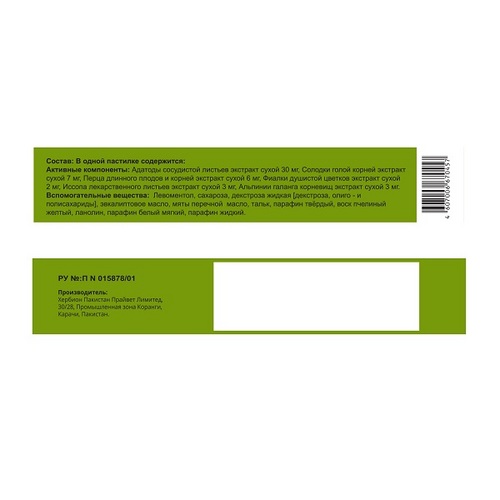 адатоды сосудистой экстракт 30 мг, альпинии галанги экстракт 3 мг, иссопа лекарственного экстракт 3 мг, перца длинного экстракт 6 мг, солодки голой корней экстракт 7 мг, фиалки пахучей экстракт 2 мг