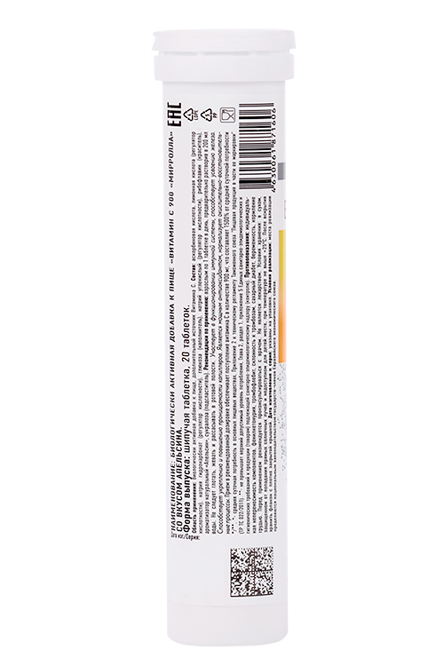 Состав: аскорбиновая кислота, лимонная кислота (регулятор кислотности), натрия гидрокарбонат (регулятор кислотности), глюкоза (наполнитель), натрий углекислый (регулятор кислотности), рибофлавин (краситель), ароматизатор натуральный «Апельсин», сукралоза (подсластитель).