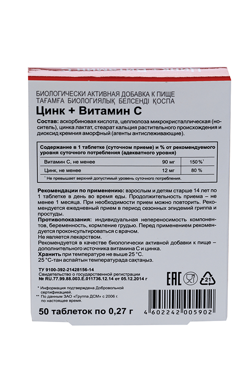 Принимая Цинк + Витамин С от Эвалар, вы получаете цинк в форме лактата, в пределах 80% необходимой суточной нормы (20% содержит суточный рацион) и витамин С – 150%. Целесообразно принимать Цинк + Витамин С на протяжении всего эпидемиологического периода, а не ждать, когда вы заболеете.