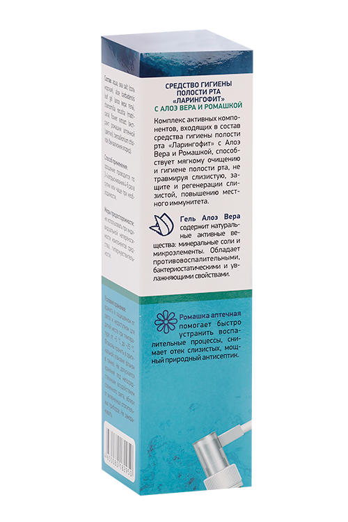 ,«Ларингофит» с Алоэ вера и Ромашкой (аптечной) применяется с лечебными, профилактическими и гигиеническими целями для очищения, снятия раздражения и защиты слизистой оболочки горла (инфекционных, аллергических, атрофических), состояний после хирургических вмешательств в полости рта и горла, в период подъема простудных заболеваний.