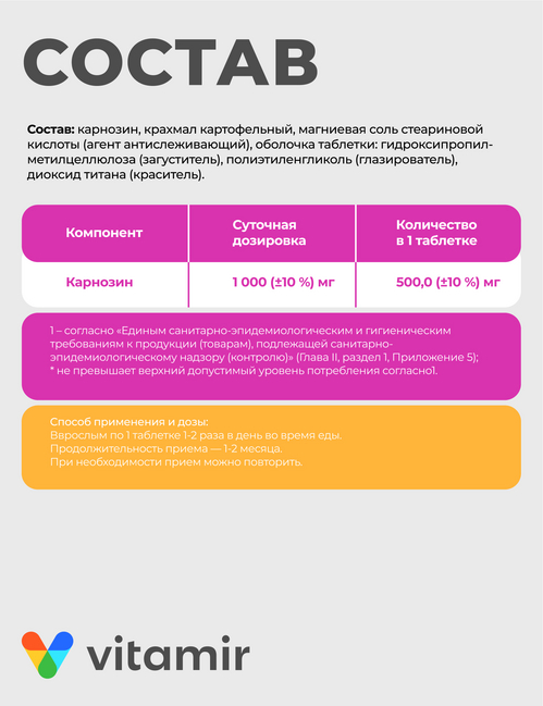 Карнозин, крахмал картофельный, магния стеарат (агент антислеживающий), оболочка таблетки: гидроксипропилметилцеллюлоза (загуститель), полиэтиленгликоль (стабилизатор), диоксид титана (краситель).
