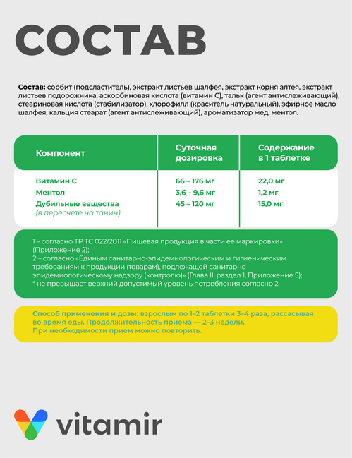 Состав: экстракт шалфея 25мг, экстракт алтея 25мг, экстракт подорожника 25мг, аскорбиновая кислота 25мг, эфирное масло шалфея 4мг.