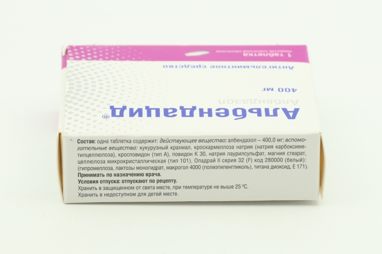 Состав:  ,одна таблетка содержит: действующее вещество: албендазол – 400,0 мг,  , , , , , , , , , , , , , , , , ,вспомогательные вещества: , крахмал кукурузный, кроскармеллоза натрия (натрия  , , , , , , , , , , , ,карбоксиметилцеллюлоза), кросповидон ,(тип А), повидон К 30, натрия лаурилсульфат, магния стеарат, целлюлоза микрокристаллическая (тип 101), готовое пленочное покрытие (пленкообразователь - белый): гипромеллоза, лактозы моногидрат, макрогол 4000 (полиэтиленгликоль), титана диоксид (Е 171).